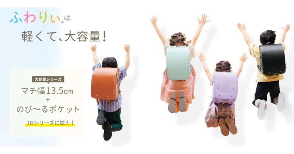 ふわりぃの大容量モデルはマチ幅13.5cmを確保。「のび~るポケット」搭載のモデルは、軽さ+収納の両方を求める家庭に人気です。