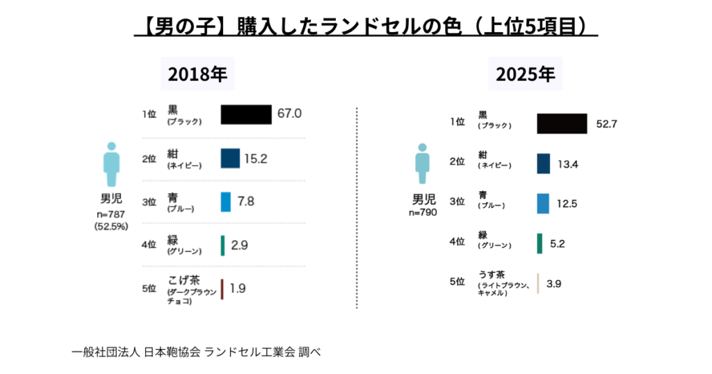 男の子は今だ半数以上が黒を使用していますが、2018年度の調査では67%を占めていたことを考えると年々減少傾向にあることが分かります。一方で、青や紺、緑といったカラーが占める割合が増えているのも特徴です。